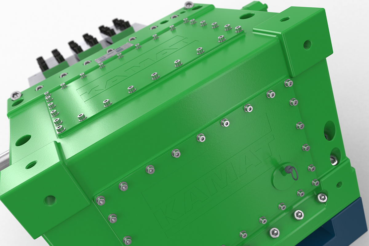 K35000高壓泵的驅(qū)動功率為350 kW,非常適合噴射和液壓應用。 例如,它經(jīng)常與大型移動式噴射系統(tǒng)一起使用,已在化工行業(yè)服務多年,并在采礦行業(yè)滿足流量從400至600 l升/ 分鐘的需求。 在這種情況下,帶有強制潤滑齒輪和油冷卻器的K35000可以滿足24/7全天候運行的要求。 K35000高壓泵采用經(jīng)典的KAMAT模塊化組件系統(tǒng)構建,因此可以靈活地適應工作壓力和介質(zhì)等要求。 因此,它也經(jīng)常用于過程處理領域。